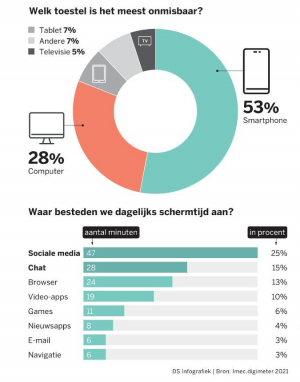De gemiddelde schermtijd is tijdens de lockdowns naar boven geschoten. Ondanks dat de lockdowns verleden tijd zijn, bleef onze schermtijd in 2021 stijgen al is het maar met drie minuten. We spenderen vooral meer tijd aan apps die ons de kans geven om naar muziek te luisteren, onze geldzaken te regelen en ons op de hoogte te houden van het nieuws. Toch gaat het meeste van onze tijd naar sociale media en jongeren spenderen hier gemiddeld het meeste tijd aan. Klassieke media zoals Facebook en Messenger gaan achteruit terwijl Tiktok massaal wint. Ongeveer zestig procent van de jongeren gebruikt Tiktok dagelijks en dat voor meestal iets langer dan een uur. Niet alleen de klassieke sociale media verliezen aan populariteit, ook de tv-zenders verliezen en dat aan de streamingdiensten zoals Netflix, Disney+ en Streamz.